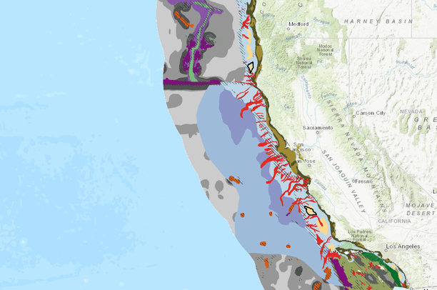 This map has been created to support California offshore wind energy planning by the Intergovernmental Renewable Energy Task Force. Physical setting datasets include seafloor geomorphology, bathymetry, sediment, and seafloor geology.