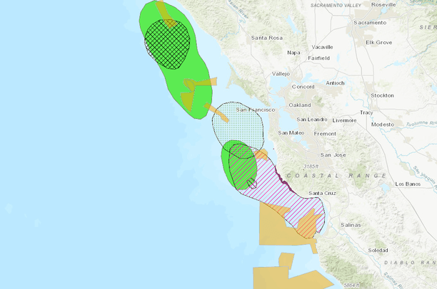 This map depicts some of the biological resources offshore along the Central California coast. Species included may or may not be harmed by offshore wind development.